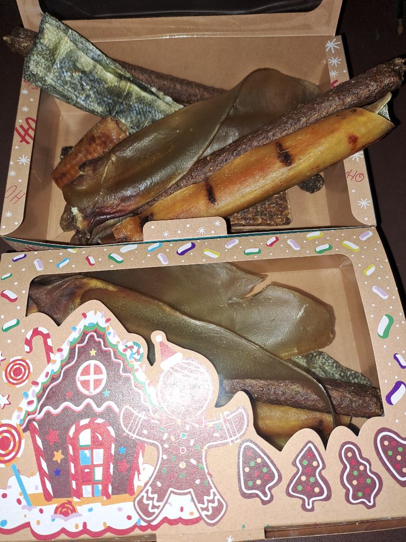 Includes 12 different tasty dog treats and chews in a Christmas box.