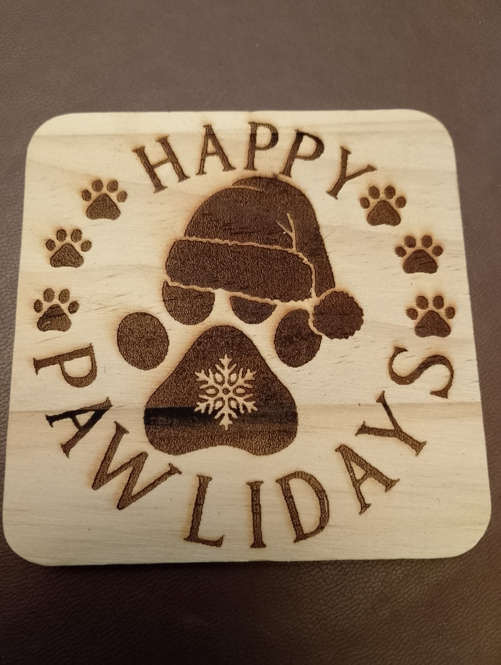 Festive laser engraved solid wooden coaster – ‘Happy Pawlidays’
