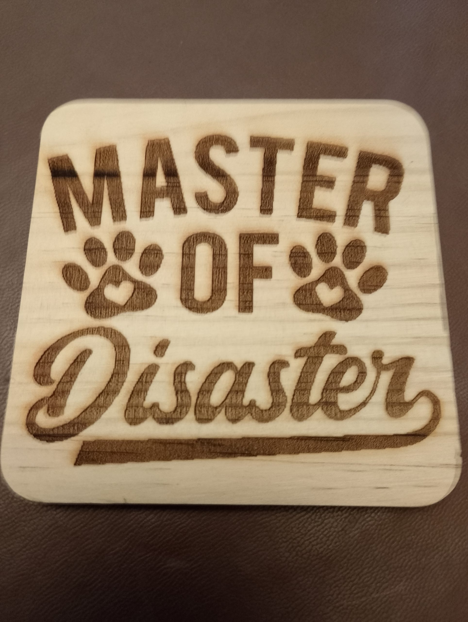 Festive laser engraved solid wooden coaster – ‘Master of Disaster’